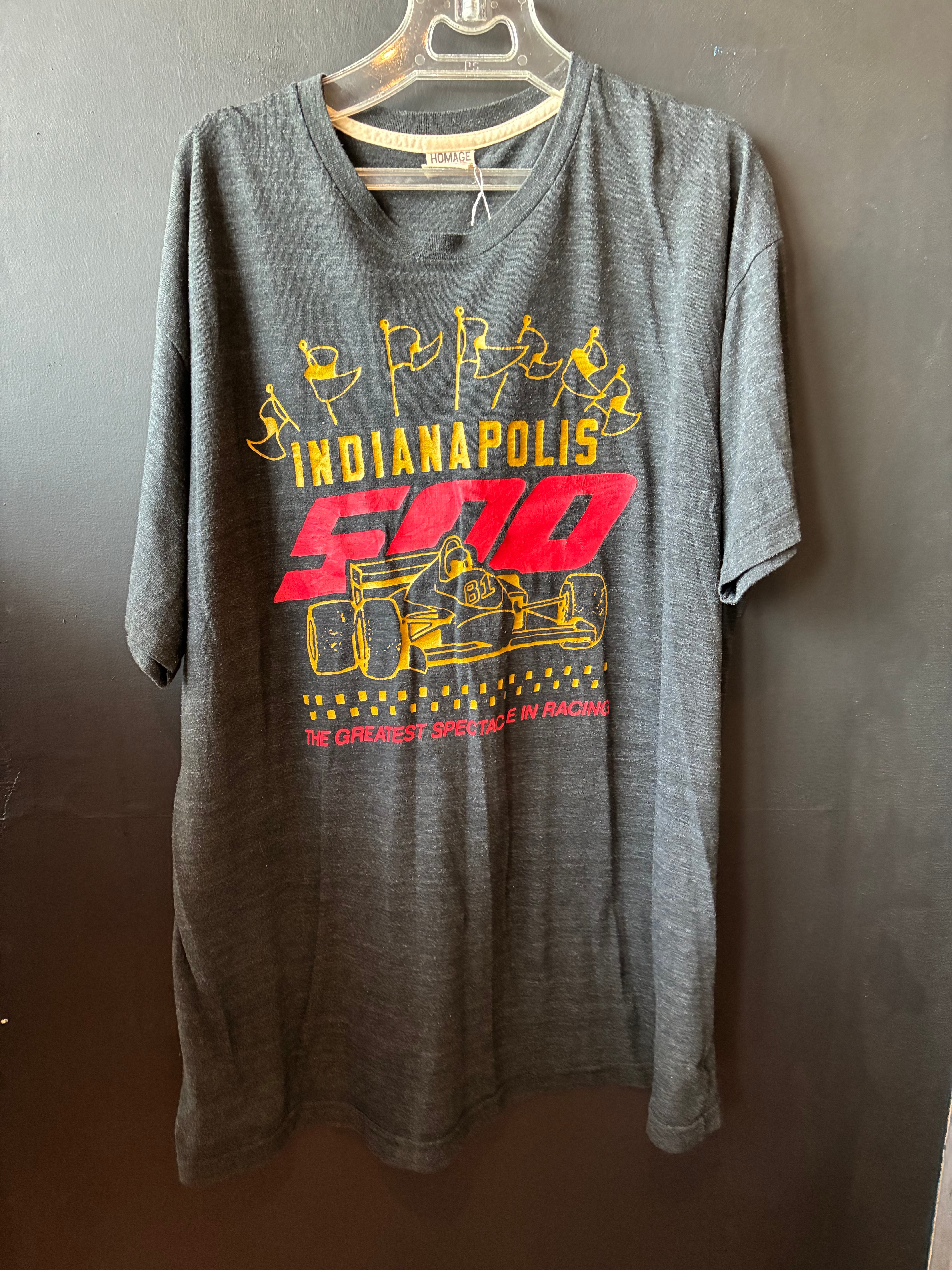 アメリカの人気ブランド「HOMAGE(オマージュ)」製のプリントTシャツ。モータースポーツの聖地・インディアナポリス500(INDIANAPOLIS 500)をモチーフにした一着です。