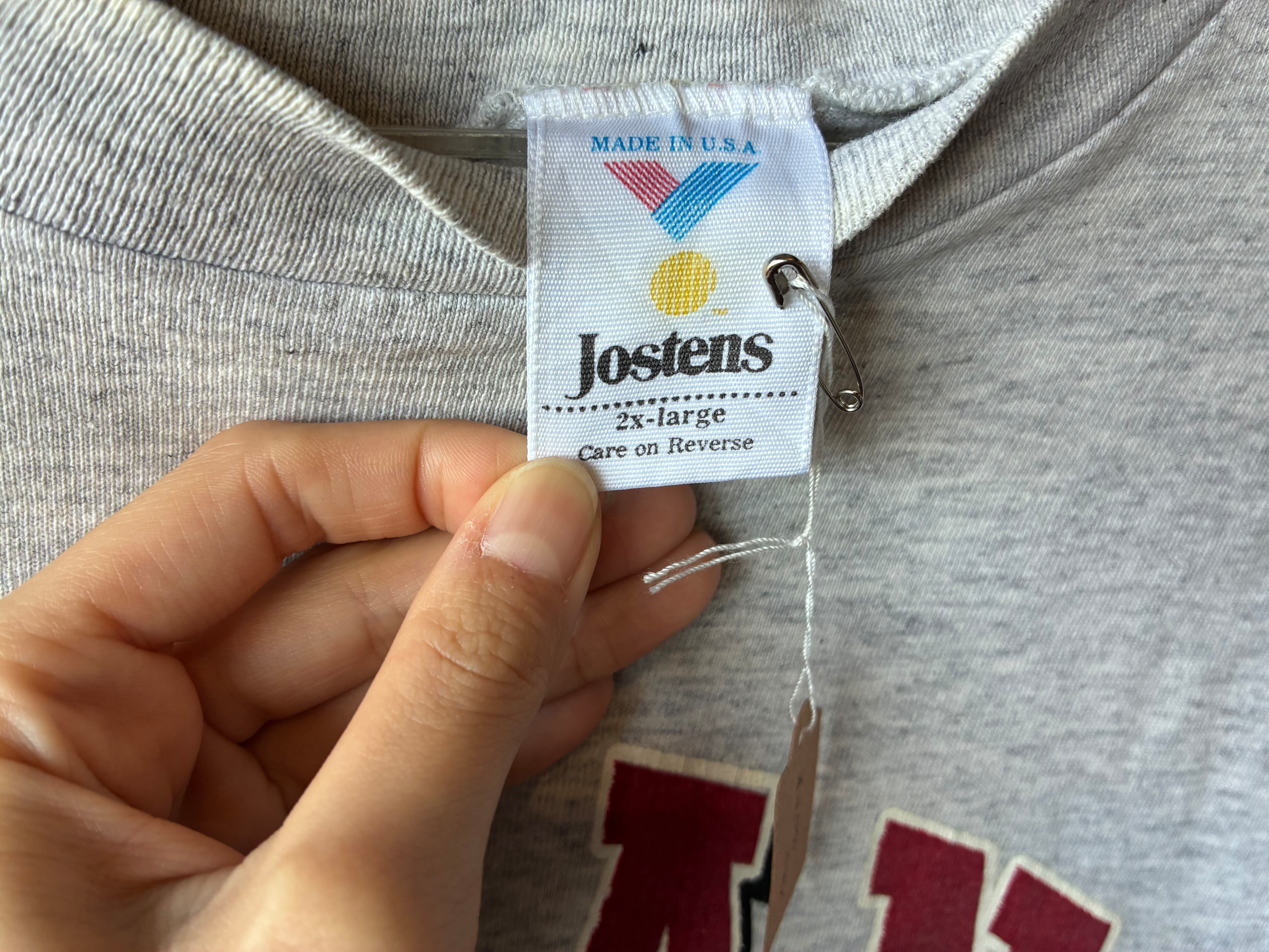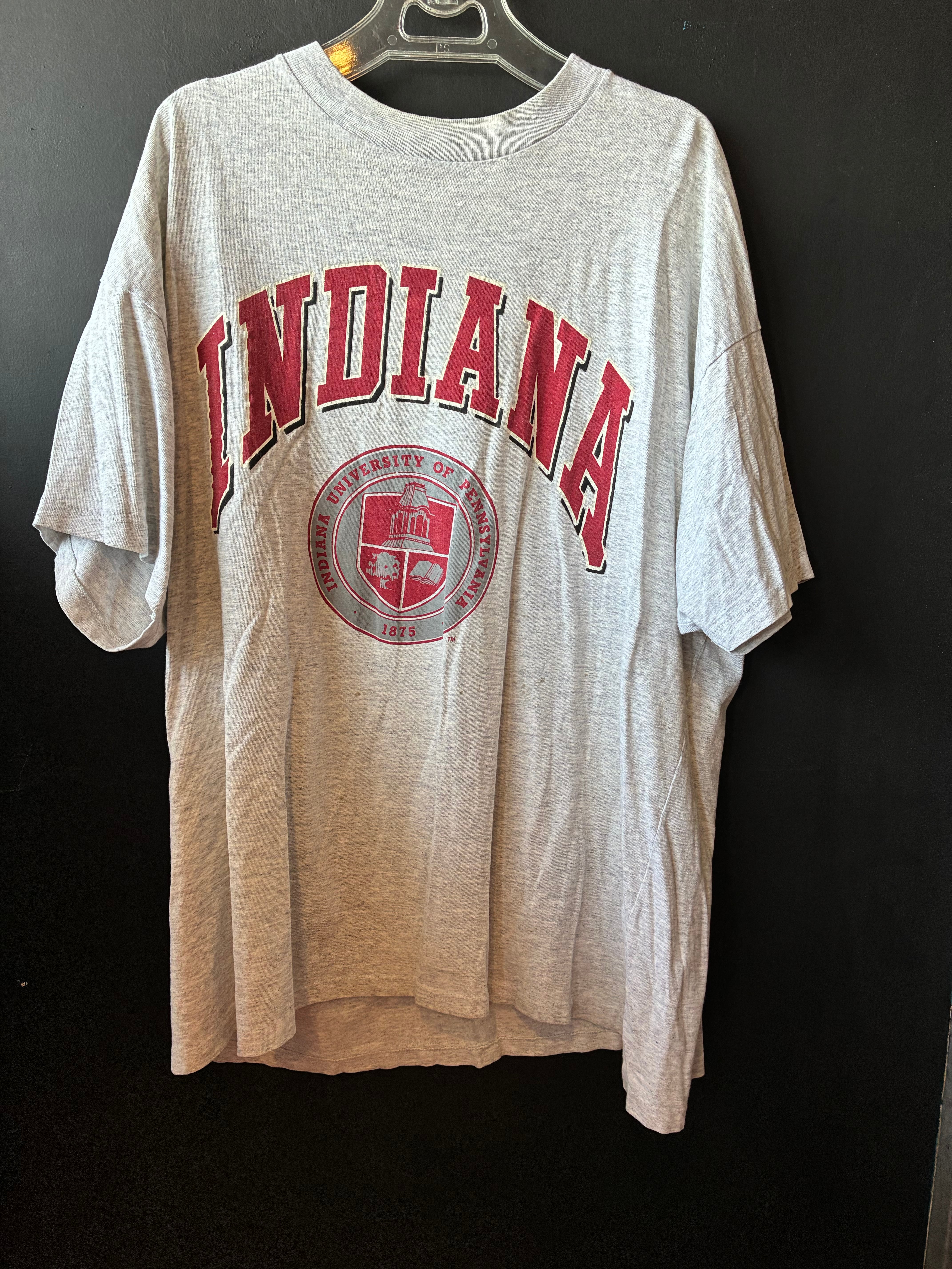 Jostens(ジョステンズ)製、アメリカ製のカレッジTシャツ。杢グレーのボディに、深みのあるバーガンディの「INDIANA」ロゴと大学のエンブレムがプリントされた定番の一着です。