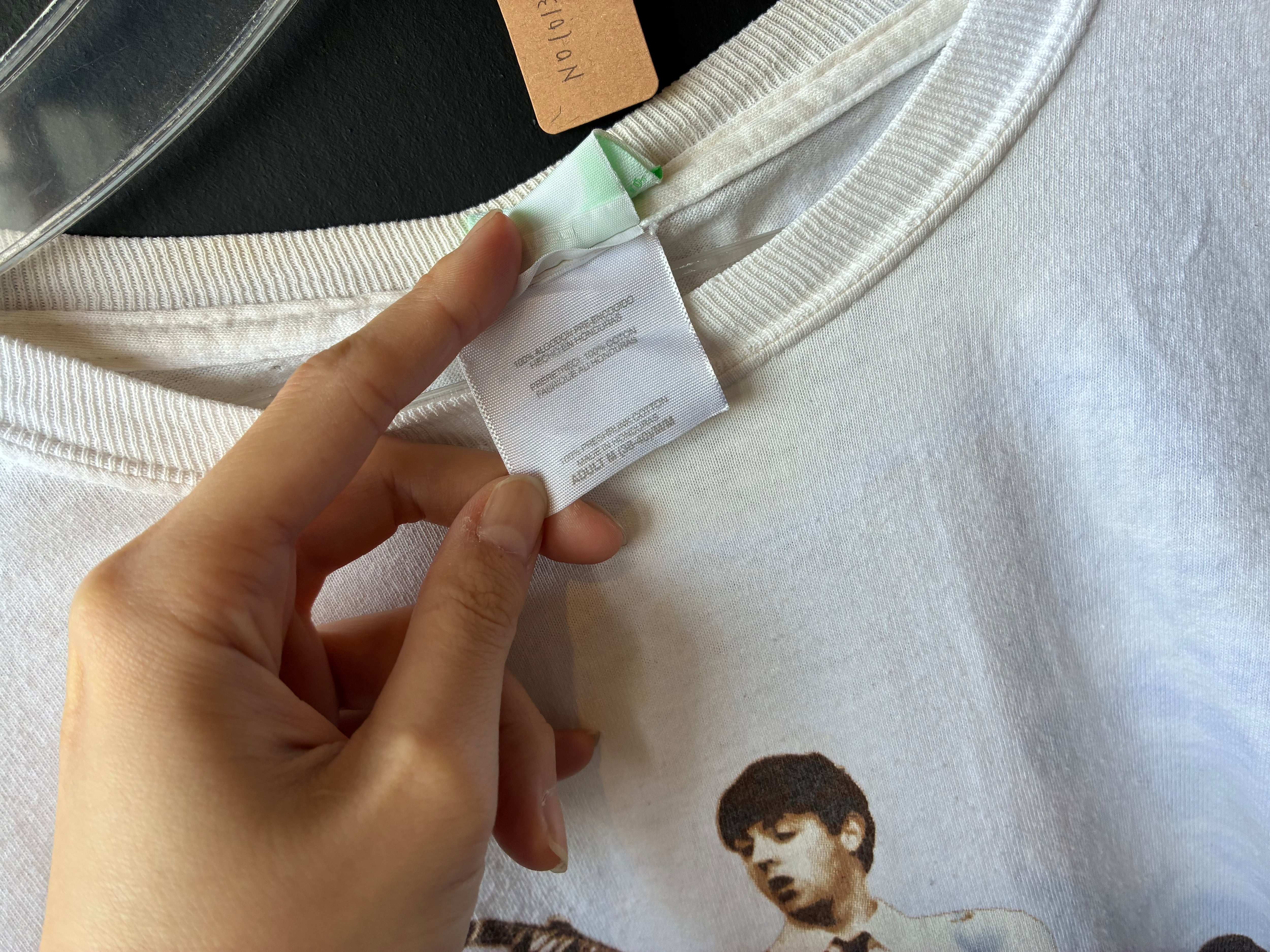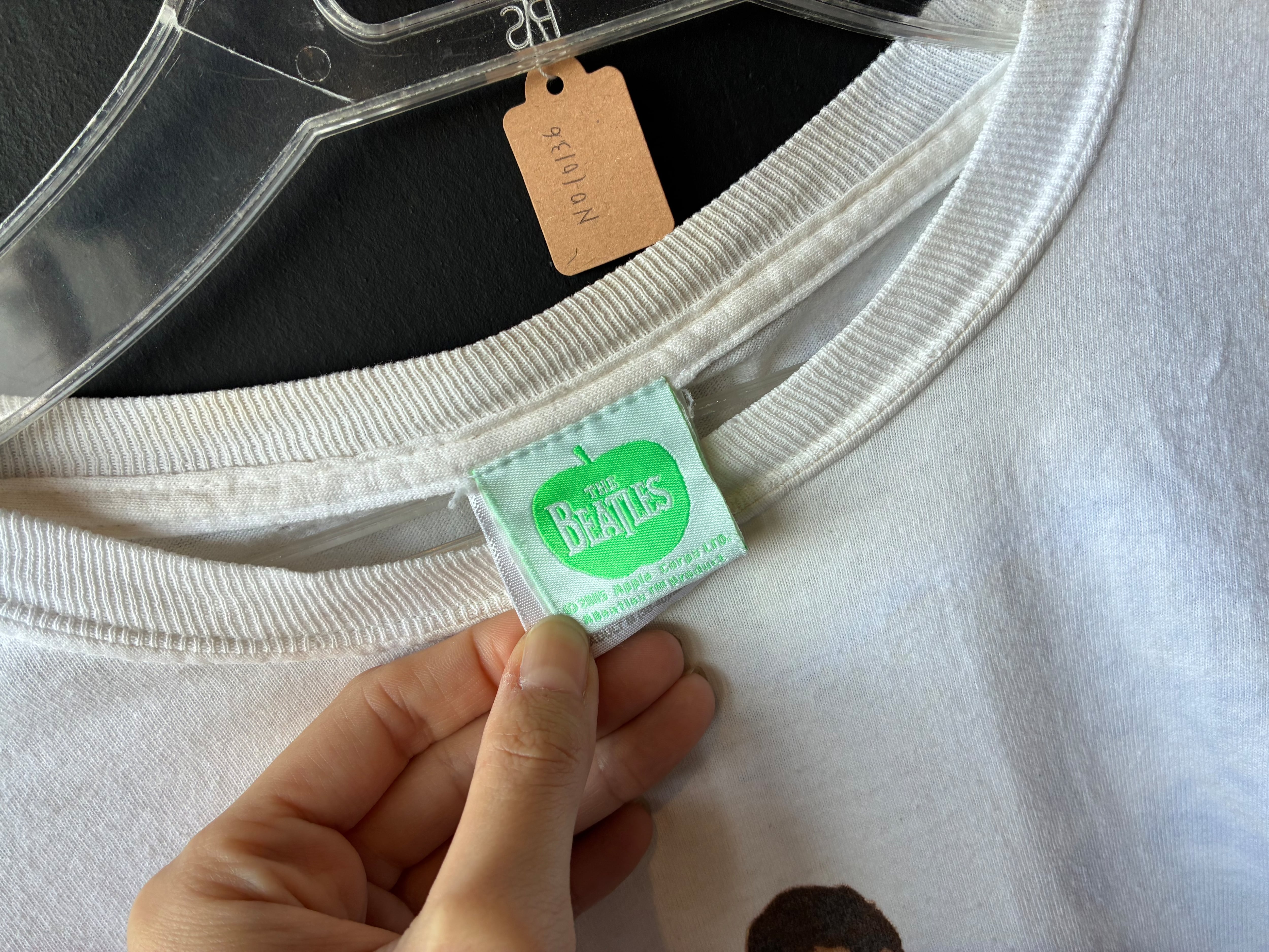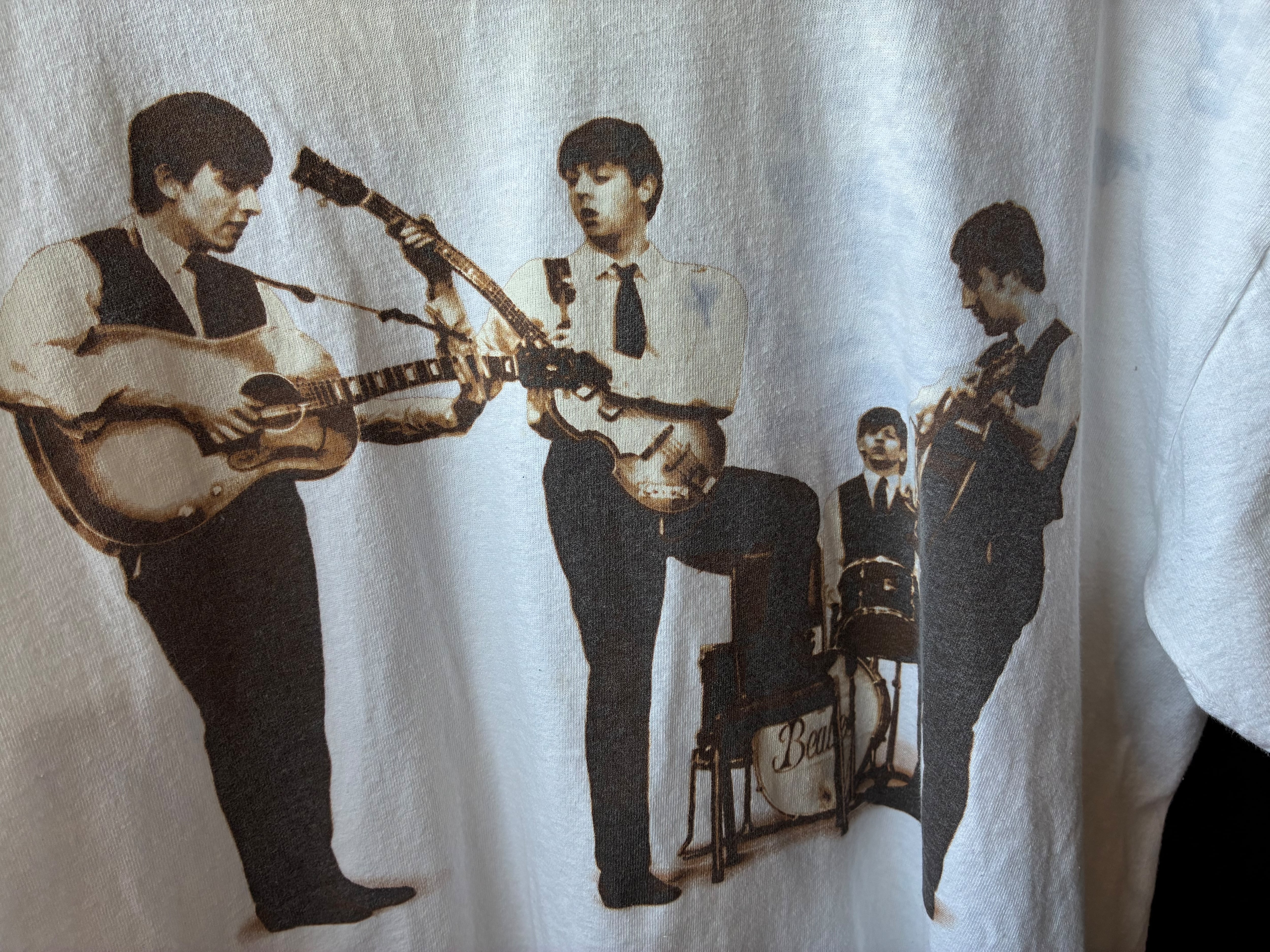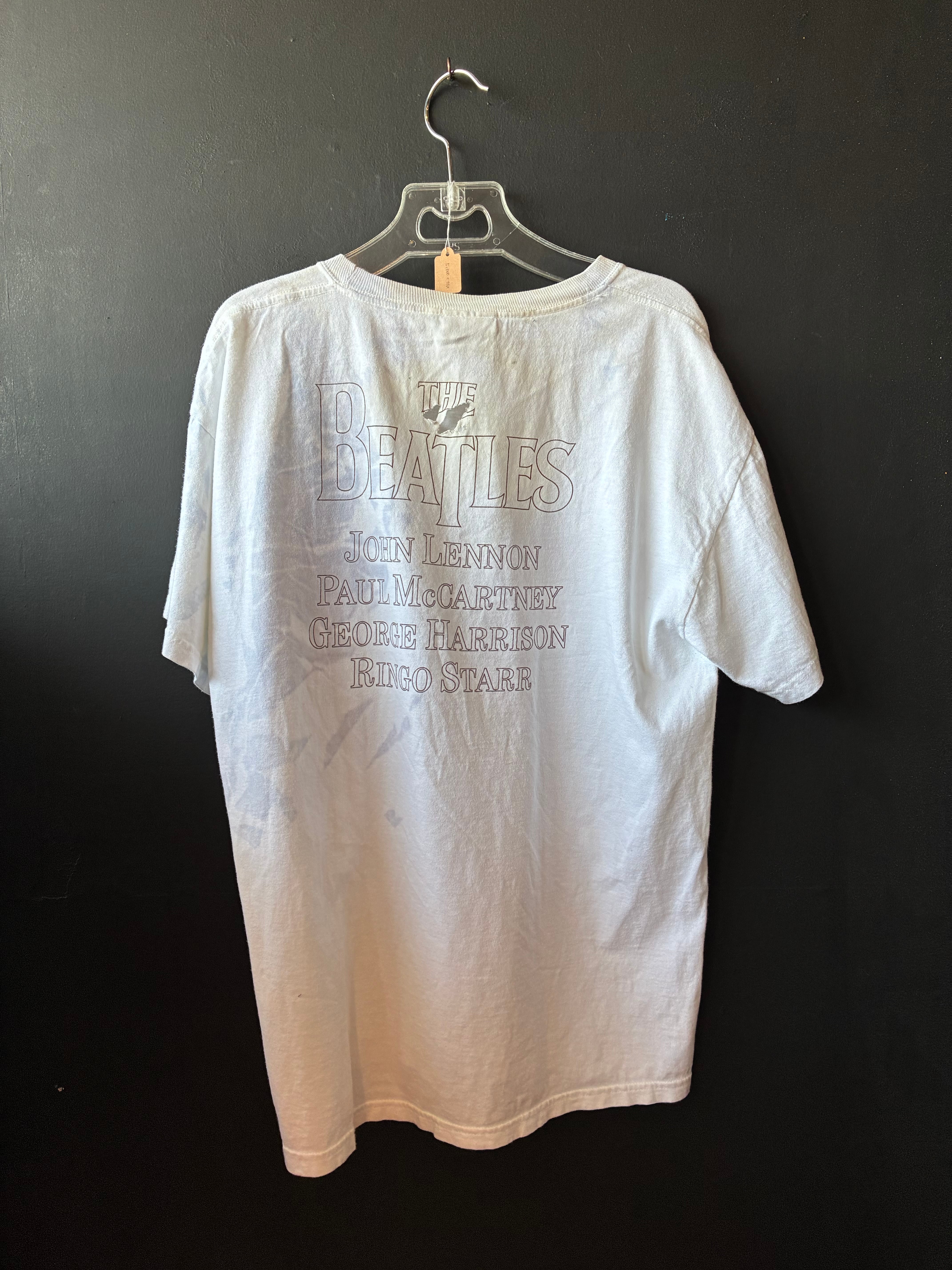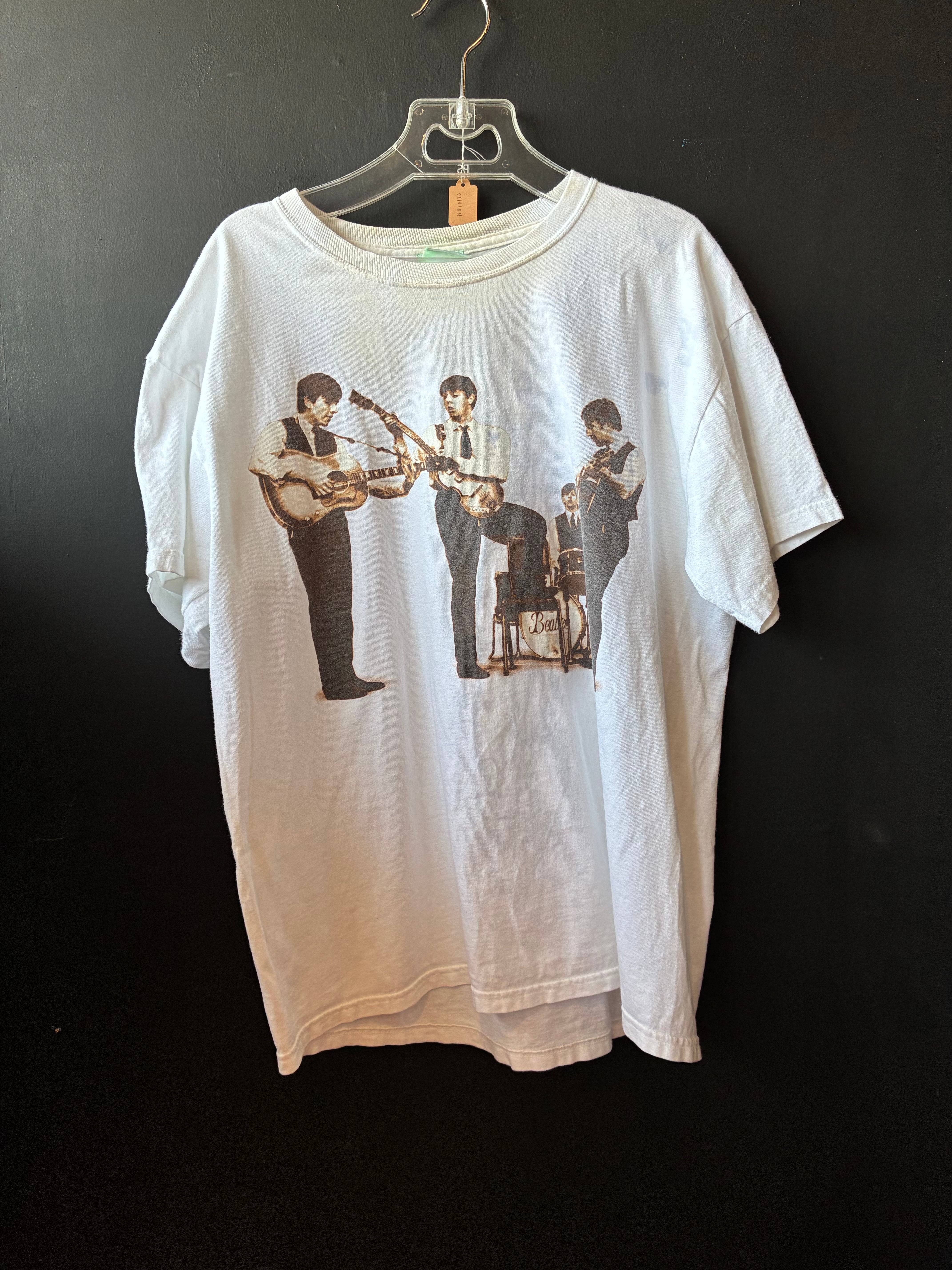 The Beatles公式ライセンスTシャツ。2000年代製で、フロントにはメンバー4人の演奏風景、背面にはバンド名と名前が大きくプリントされたインパクトある一枚です。
