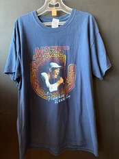 アメリカのソウル/ファンクバンド「Maze featuring Frankie Beverly」のプリントTシャツです。ネイビーのボディに、色鮮やかなネオン調デザインのフロントプリントが映える一枚。中央にはマイクを握るFrankie Beverlyの姿がプリントされており、ファンのみならず音楽・ブラックカルチャー好きにもおすすめのアイテムです。
