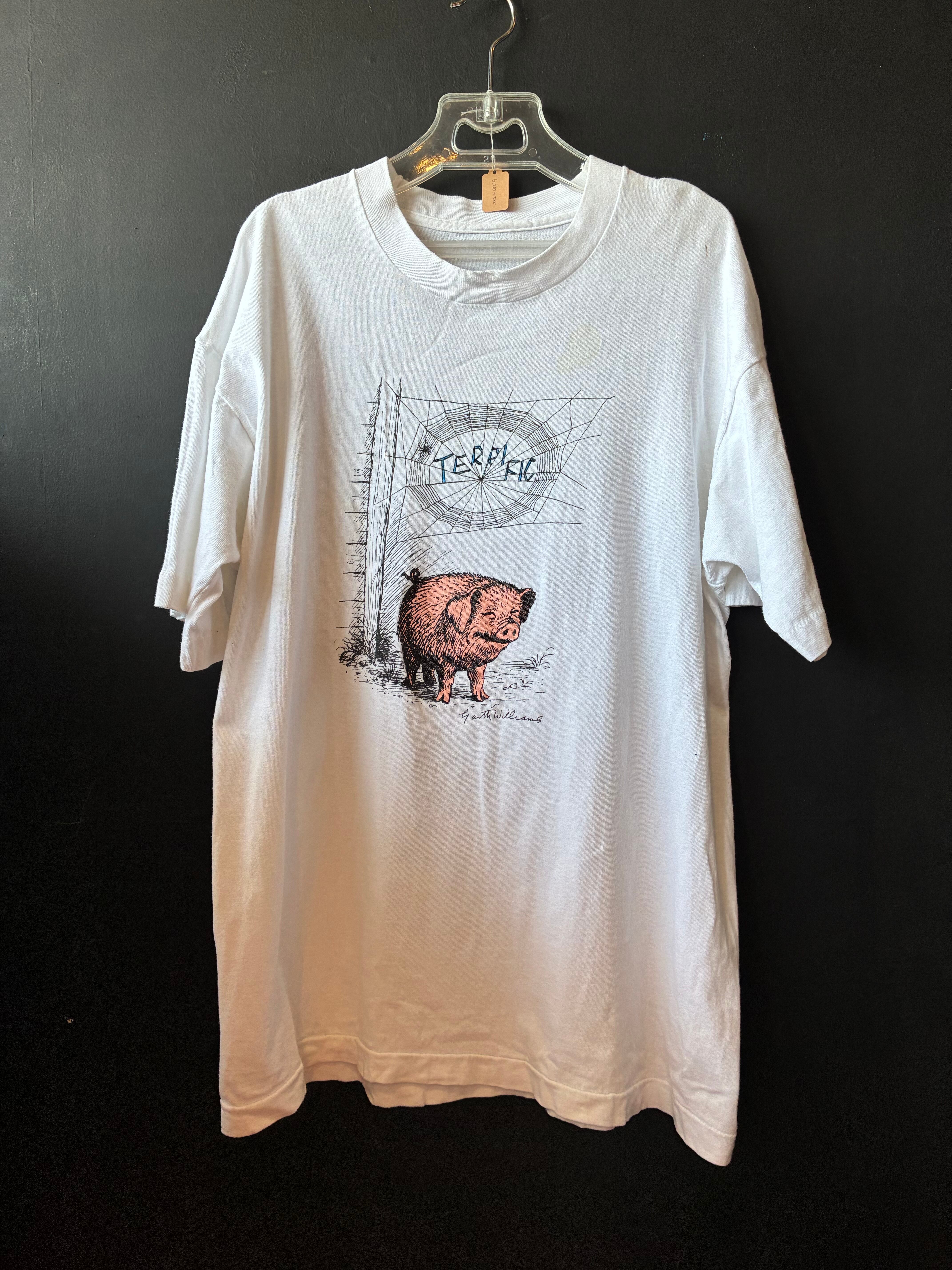 絵本『シャーロットのおくりもの』の名シーンをモチーフにした、存在感抜群のプリントTシャツ。蜘蛛の巣に「TERRIFIC(すばらしい)」と書かれ、その下に主人公ウィルバーが描かれた可愛くも味のある一枚です。