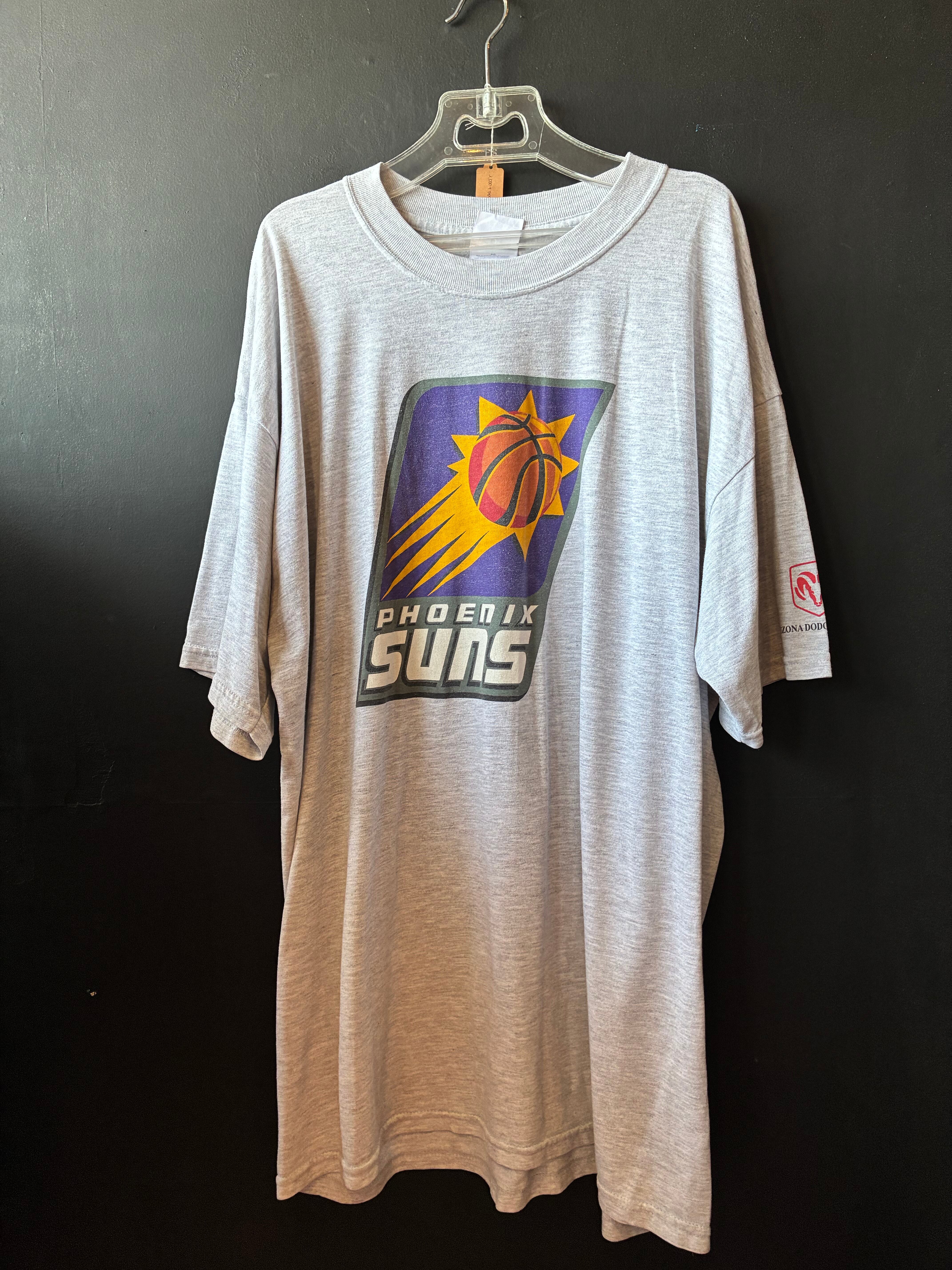 NBAチーム「フェニックス・サンズ」のロゴがフロントに大きくプリントされた、存在感抜群のヴィンテージTシャツです。袖にはARIZONA DODGEの刺繍ロゴも入った希少な一枚。