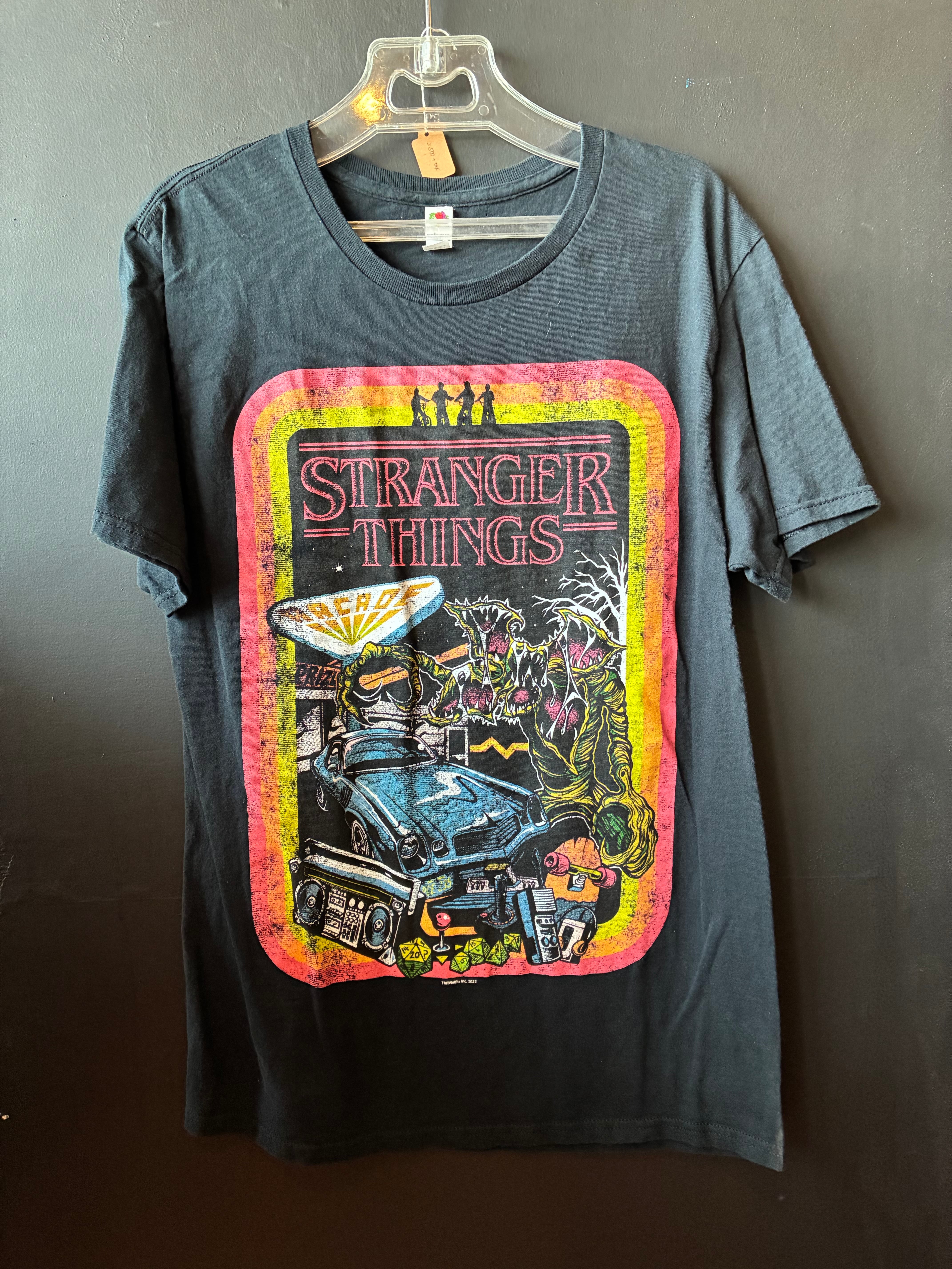 アメリカンレトロなタッチで描かれたイラストが目を引く一着。『Stranger Things』ファンはもちろん、80sカルチャーが好きな方や、ポップなデザインTをお探しの方におすすめ。ストリートにも映えるアイテムです!