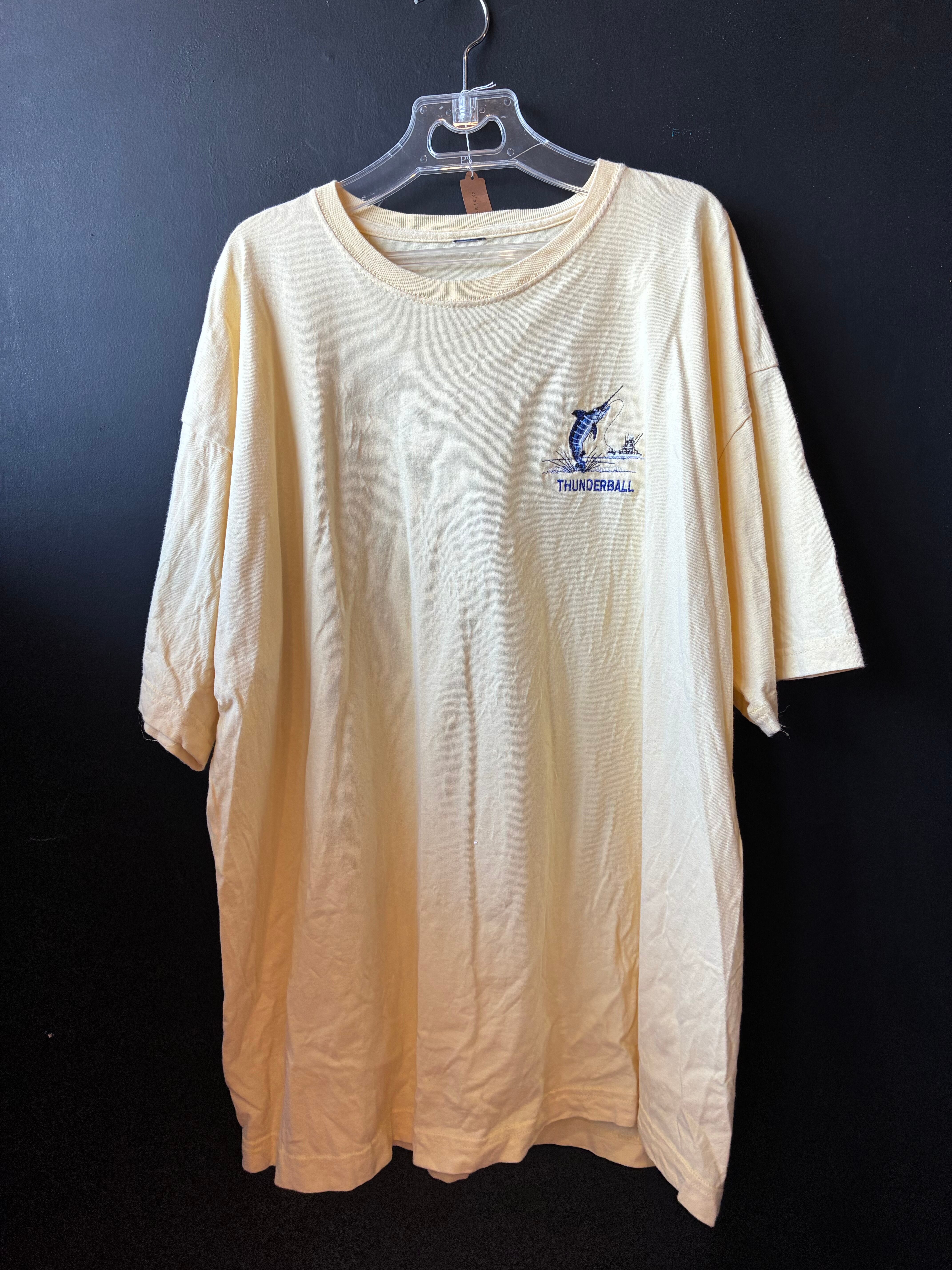背面は無地、フロントには豪快に跳ねるマーリンとボートの刺繍が施された、THUNDERBALLの半袖Tシャツ。ナチュラルなクリーム系カラーが柔らかく、リラックス感のある一枚です。