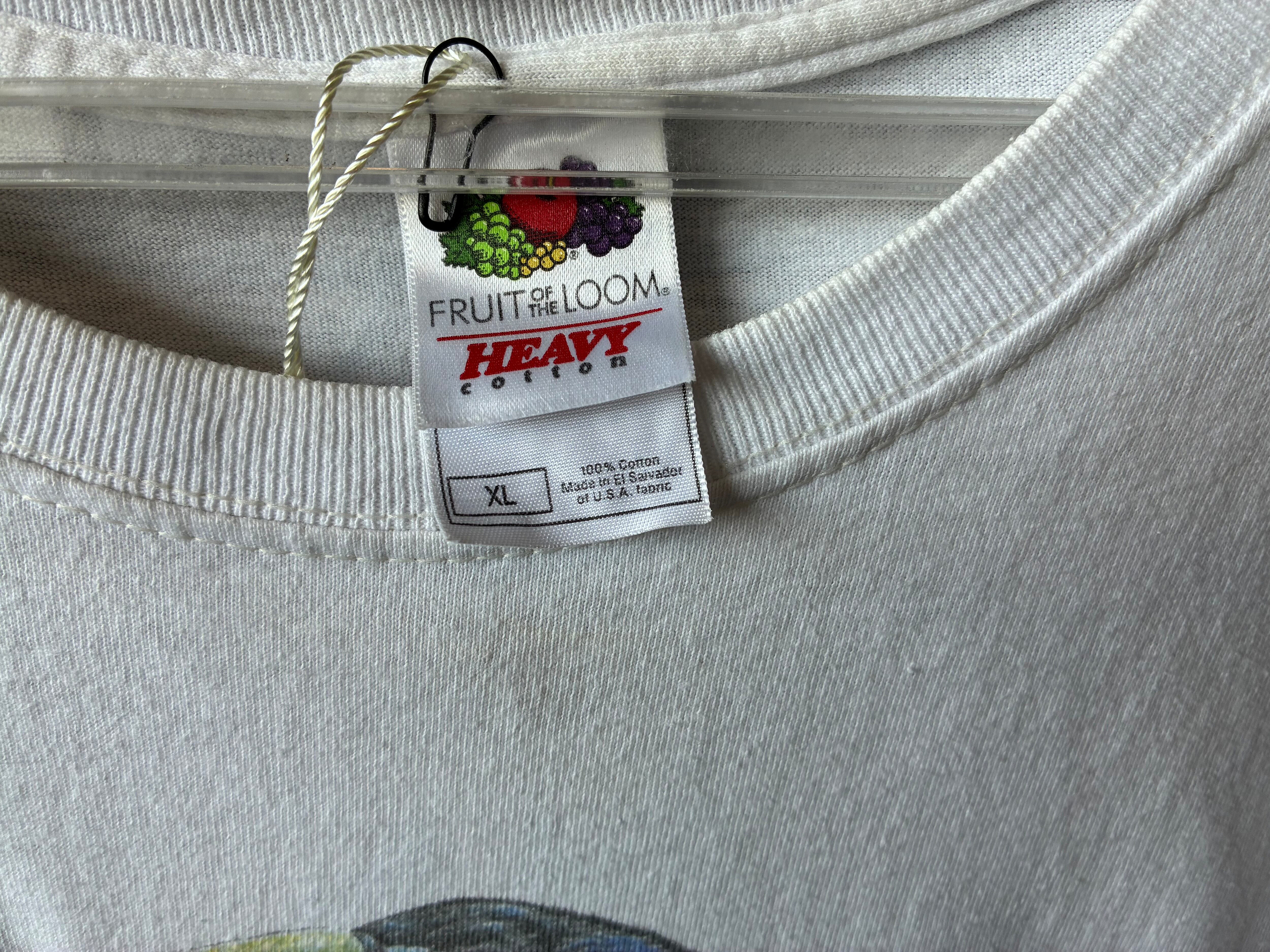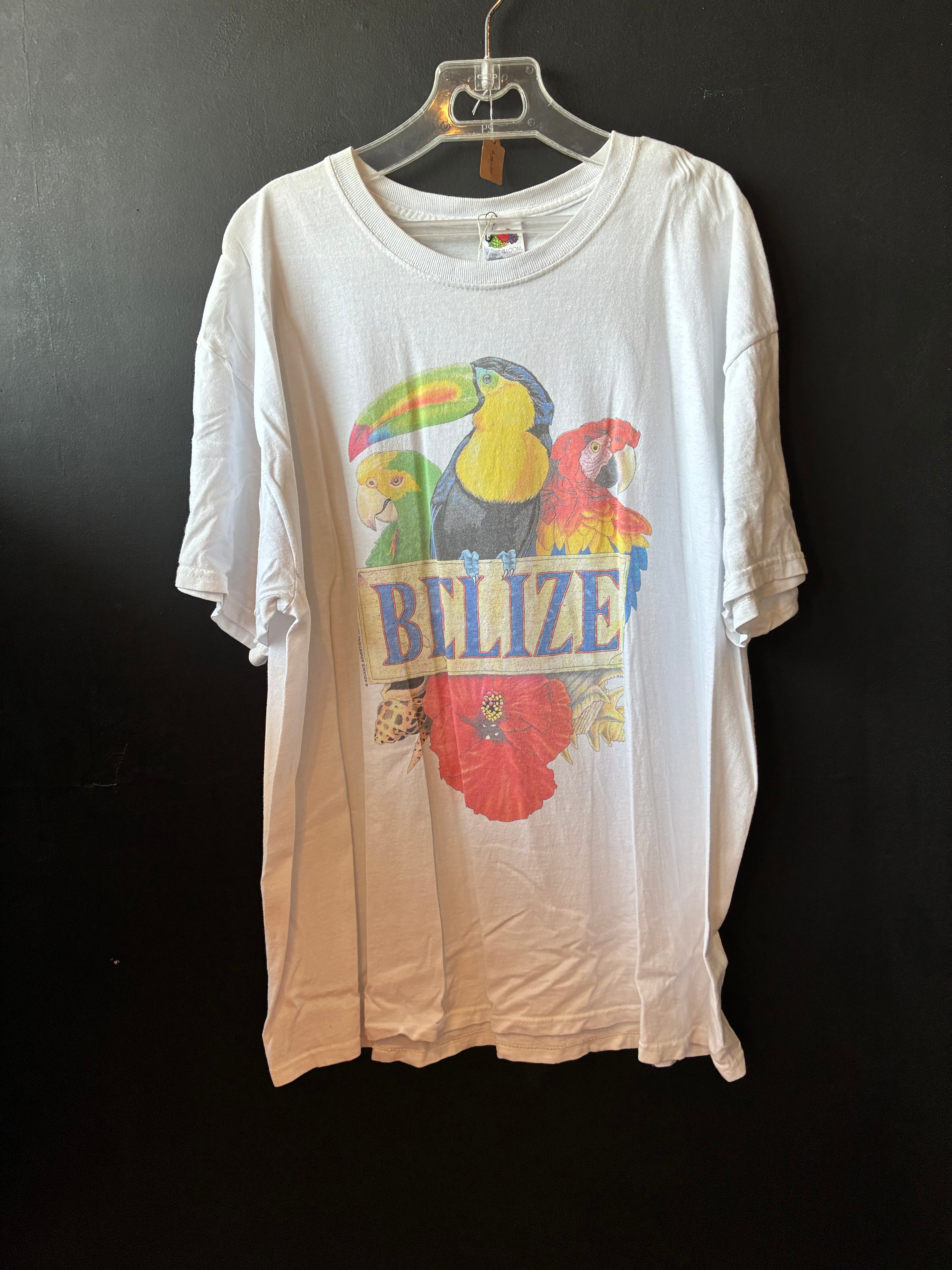 BELIZE(ベリーズ)の鮮やかなトロピカルバードと花のプリントが印象的な一着。フルーツオブザルームの「HEAVY COTTON」タグ付きで、ボディもしっかりとした厚みがあります。