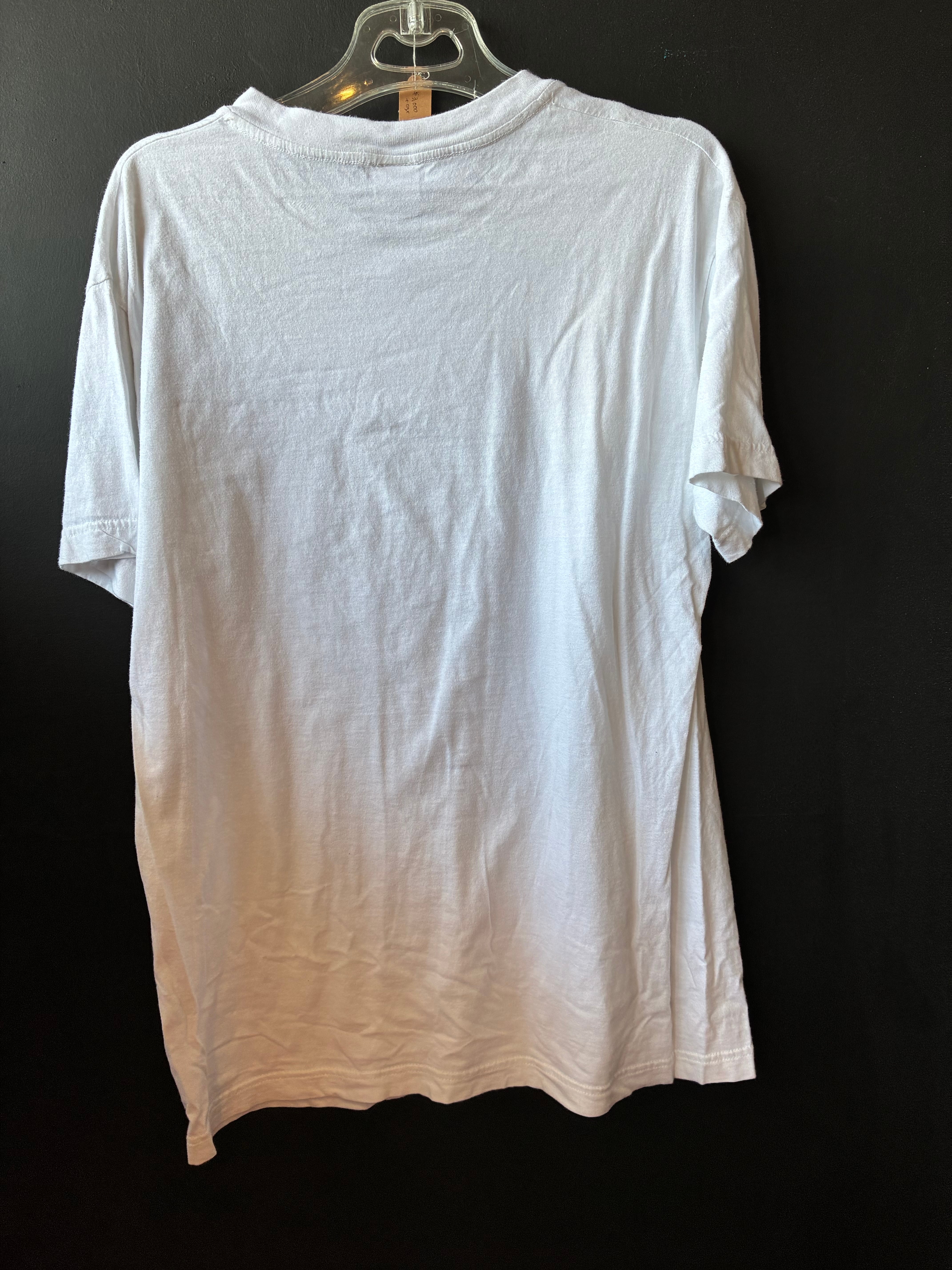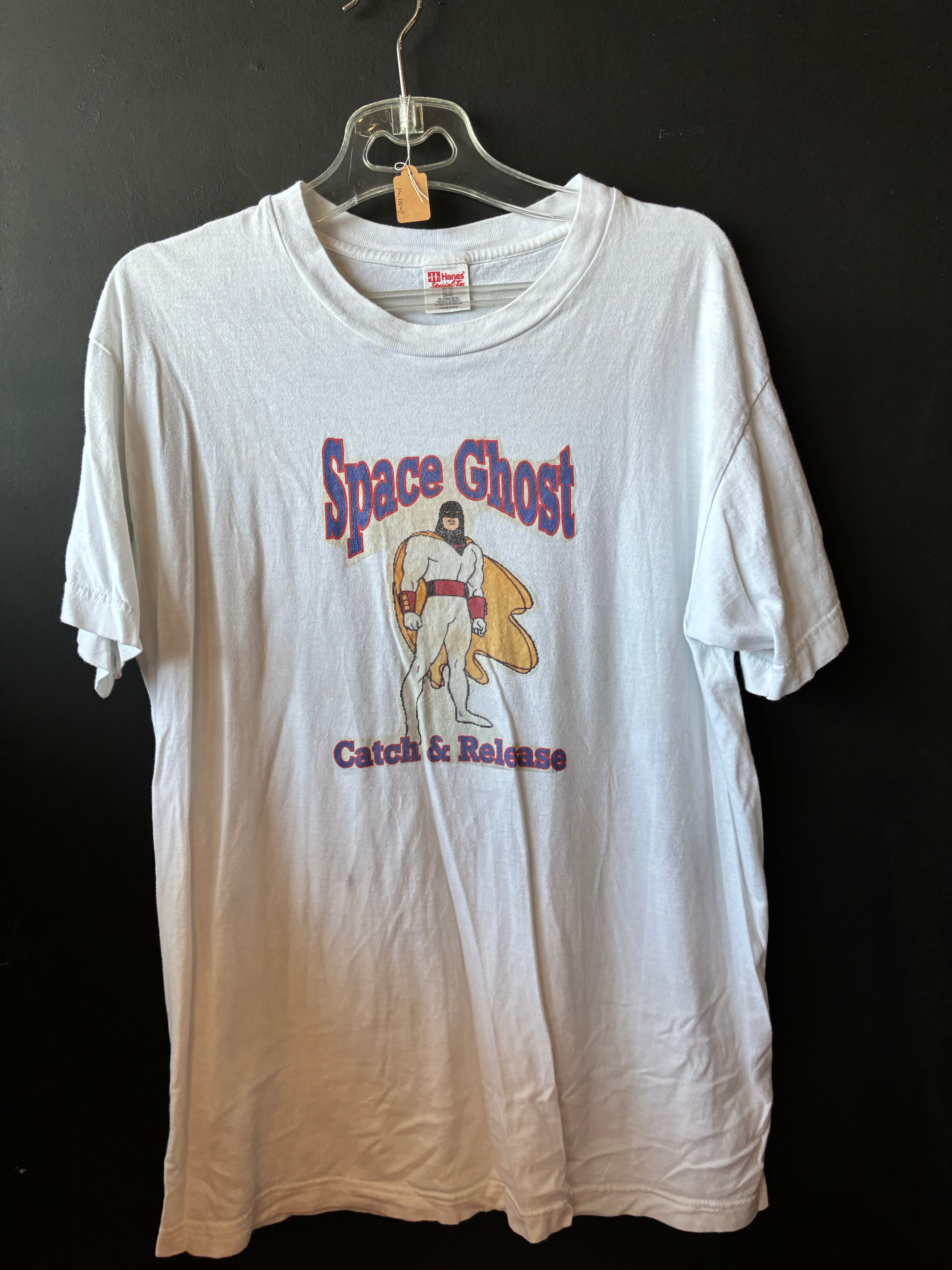 アメリカのカートゥーンキャラクター「Space Ghost」が大きくプリントされたヴィンテージ感あふれる一枚。中央にはコミカルなヒーローの姿と「Catch & Release」のメッセージが入っており、90年代テイストなユーモアが光ります。ボディはHanesのSpecial Teeを使用。タグのデザインやコットンの質感から、2000年代前半〜中頃に製造された可能性があります。程よくヤレたプリントが古着らしい雰囲気を演出してくれます。